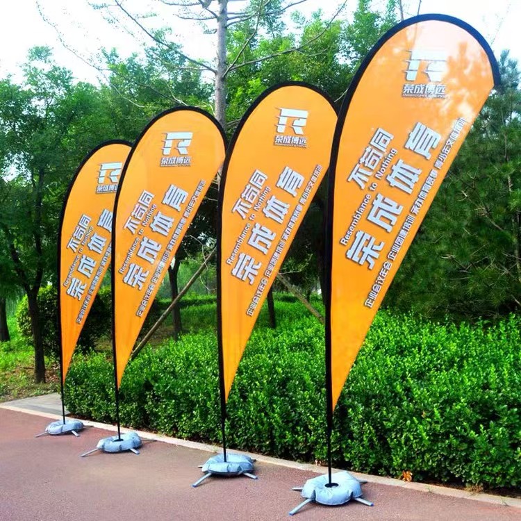 5 米注水旗采用铝合金伸缩杆支撑,搭配可注 72L 水或干细沙的稳固底座,抗风性能优异,能适应西安户外多样环境。旗面选用春亚纺面料,实现高清晰度双面透印,色彩饱满鲜艳,画面尺寸可达 3.6m×1.2m,适用于赛事沿线、展会外围、商业宣传等场景的阵列式展示。道旗则可根据场地需求定制尺寸,与注水旗形成立体宣传矩阵,强化品牌曝光。